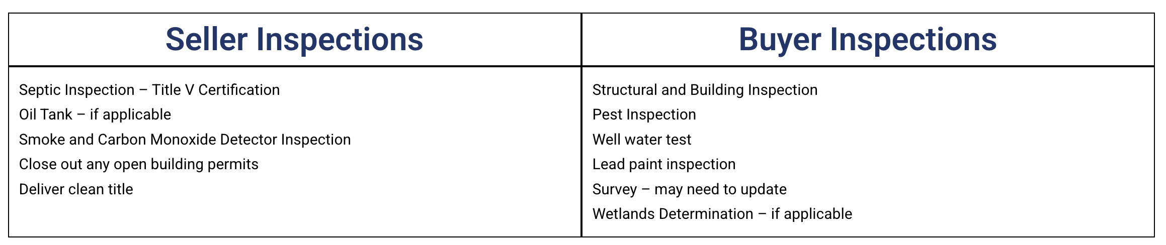 Below is a list of typical inspections or due diligence tasks that a Seller and a Buyer may need to do. Please note that some may or may not apply depending upon the particular property.