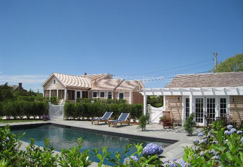 In-Town Gem. Cottage, pool cabana and pool ideally sited on an elevated half acre lot steps to Main Street. Renovated from top to bottom in 2009 with perfection. The cottage boasts 3 bedrooms, 2 full baths, Gourmet's kitchen with cathedral ceilings and classic beadboard detail, cozy living room, open dining room that leads to the screened in porch. Surround sound in the living areas. The pool cabana is perfect for summer living and includes a "bonus" room and full bath. French doors open to the pergola covered blue stone patio surrounding the dark blue Gunite pool. Large building site for a future second dwelling. Offered fully furnished. Must see!