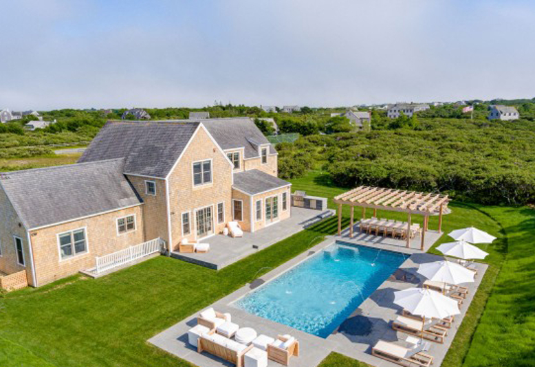 Private and secluded in Tom Nevers East - Summer living awaits you in this classic and beautifully renovated five bedroom, 6.5 bath home on 2.76 acre parcel abutting 28 acres of Land Bank conservation. traditional floor plan with expansive entertaining areas, gourmet kitchen open to family room, Living Room, laundry/mud room and dining area. Primary Bedroom with ensuite bath on first floor. Second floor Primary bedroom with ensuite bath and two bedrooms with ensuite baths. New Lower Level, Bedroom with ensuite bath, Bunk Room with 6 Bunks and ensuite bath, Office, Laundry room, work out room, Family room with mini kitchen area with 42 bottle wine fridge, 2 drawer fridge & dishwasher. Sono's sound system throughout house. Beautiful landscaped garden area with expansive patios, Outdoor kitchen, Pergola with dining area for 12, Fire Pit, 18 X 40 salt water heated pool.