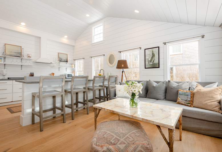 The Main House porch overlooks the beloved Sconset Chapel and tennis club. Relax and enjoy with ease, with everything right at your door. Lounge on the front porch or step inside and enjoy generous gathering space in the open living area with cathedral ceilings and shiplap walls. On either side of the entry, sitting areas invite you to relax. The space flows seamlessly into the kitchen, with a center island offering seating for 6, and making this an ideal space for entertaining. The primary bedroom includes a loft and full bath. At the back of the home, the second bedroom is bathed in natural light. A hallway leads to a four-season porch that doubles as an additional living area, with laundry area and a full bath with a tiled shower. The rear deck opens onto a spacious bluestone patio, perfect for outdoor dining, and is surrounded by a lush privet hedge for privacy.