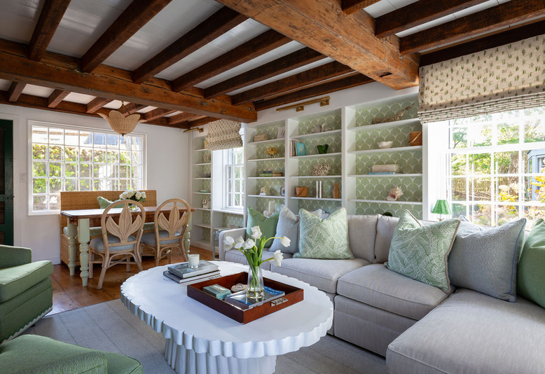 The primary living room space features many windows with views onto the gardens, built-in bookcases, and a large cozy fireplace with flat screen smart tv above. A dining table with banquette and chairs bathes in sunlight along the rear patio facing windows. A well planned galley kitchen provides functionality for cooking and entertaining, with appliances smartly concealed behind custom cabinetry panels. The farm sink and butler's pantry like shelving and cabinetry provides storage. Marble countertops and slate floor, Rohl fixtures, and dimmable architectural recessed task lighting. At the rear of the house is a spacious primary suite and en suite bathroom with a large shower.