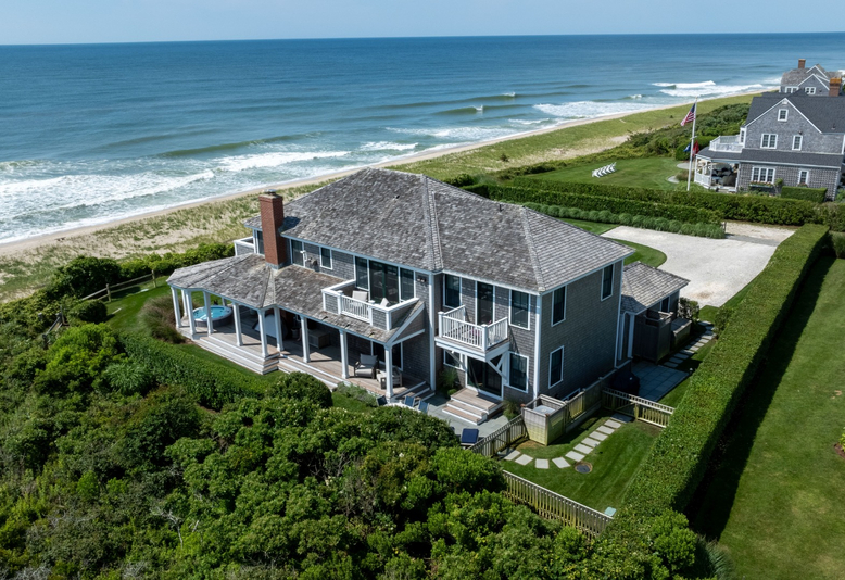 Welcome to this beautiful four bedroom waterfront home that lives as a six bedroom! The property features a charming wrap-around porch complete with a luxurious built-in hot tub, perfect for soaking and relaxation. The porch is complemented by multiple seating areas, providing plenty of spots to enjoy the outdoors, whether you're savoring a morning coffee or watching the sunset. An inviting outdoor dining area allows for al fresco meals, making it ideal for entertaining guests or enjoying family dinners under the stars. An outdoor shower adds a touch of convenience for rinsing off after beach outings. The expansive yard offers ample space for various outdoor activities and gardening. A series of steps and a well-maintained walkway lead you directly down to Tom Nevers Beach, offering easy access to the shoreline, through a well-vegetated slope.