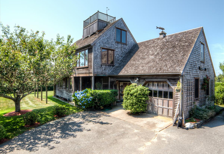Grand staircase leads to an open floor plan with cathedral ceilings. Large kitchen with counter seating and adjoining dining area. Half bath. Wood burning fireplace and continuous sliders to a wrap around deck with lovely views and outdoor shower. Great loft area with access to the widows walk via a ships ladder.