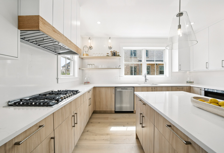 Spacious Chef's Kitchen with oversized quartz kitchen island and quartz backsplash and under cabinet lighting, dining room, living room, mud room, study, and half bath. 5 1/2" white oak floors, tile in the bathroom and laundry room with custom shelving, 9' ceilings, fireplace, detailed moldings.