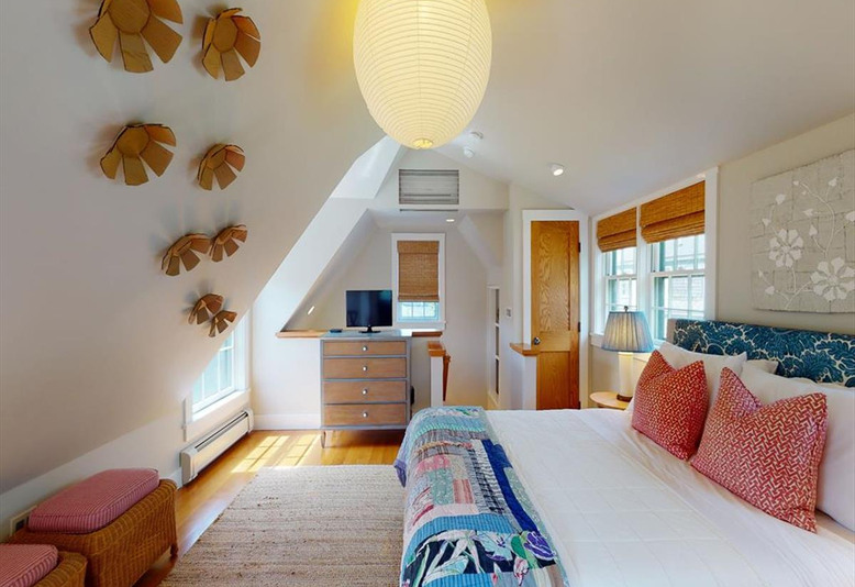The upper floor is the master bedroom with an Americana feel of Blues, Whites and Reds topped with antique wicker. Sunny and bright bedroom with closets and storage areas, tiled half bath with storage cabinets.