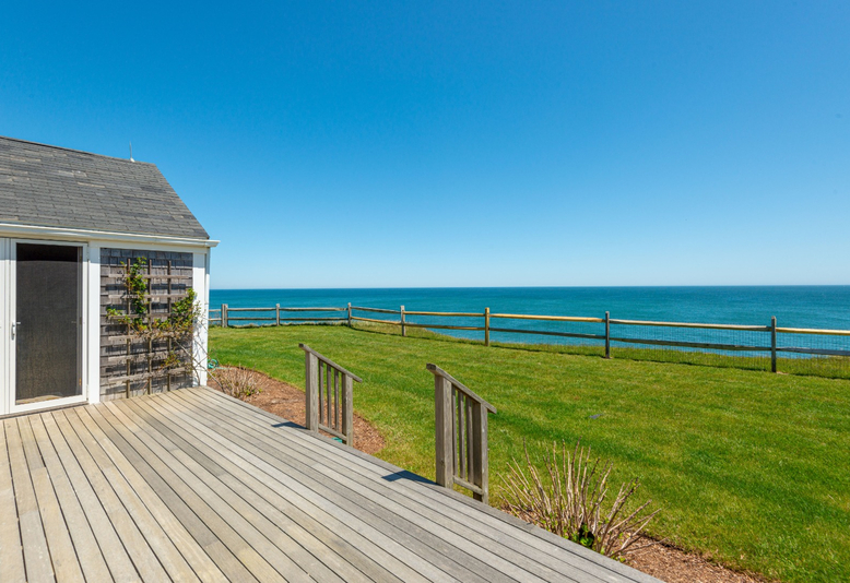 This charming original oceanfront cottage offers spectacular panoramic views of the sea on Baxter Road in Sconset. Gracious and open floor plan with generously sized living spaces, cathedral ceilings, and sea views from nearly every room. Pine paneling and hardwood flooring throughout this one-story home including a total of four bedrooms, three full baths, eat-in kitchen, dining room, and a fabulous living room with wood-burning fireplace and multiple doors and windows leading to the outside. Large wood deck and lawn fenced in by split rail to the bluff with ample off-street parking. This property is fully rented for the 2022 season with strong rental income net commissions to date 68k in 2022 and 85K in 2021.