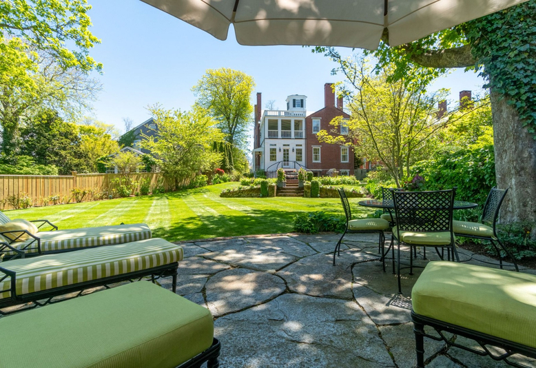 Granite steps lead up to the grand entry foyer and hall with original curved staircase; To the right are double parlors with marble fireplaces. Beyond this is the sun filled family room with large windows overlooking the gardens, patio and expansive private yard. To the left of the front hall is the office where William Starbuck conducted his business, like all the formal rooms it has a marble fireplace and high ceilings with original plaster rosettes and moulding details. The dining room has hand painted whaling era murals painted in the 1950s. The modern chef's kitchen has all of the best appliances. The large island is ideal for casual family socializing. There is an additional casual dining area in the adjoining family room.